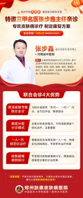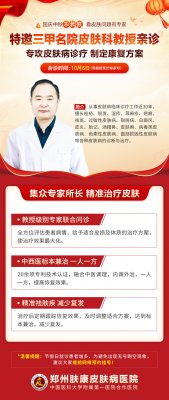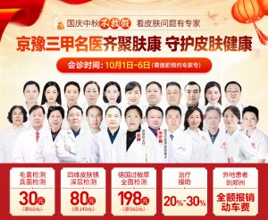 2025年10月1日-6日,国庆逢中秋,健康喜相逢!为回报广大患者的信赖,解决“看病找专家难”的问题,郑州肤康皮肤病医院特在国庆中秋假期期间,举办名医专家联合会诊活动,邀请崔静、张步鑫、高永军三位专家坐诊,让您不出远门,就能享受到国内及省内顶级皮肤专家的诊疗服务。